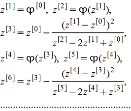 Если φ(z) действительна и трижды непрерывно дифференцируема в окресности действительного корня z, причем φ'(z)≠1, то сходимость итерационного процесса z[j+1]=φ(z[j]) можно улучшить с помощью следующей итерационной схемы: