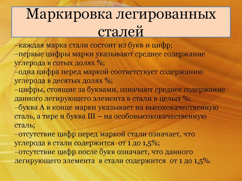 В марке содержание легирующего элемента, если оно превышает 1...1,5%, указывается цифрой (массовая доля в целых процентах), стоящей после соответствующей буквы. Если за буквой отсутствует цифра, то содержание данного элемента около 1%. Исключение сделано для некоторых элементов (V, Ti, Mo, Nb,Zr, В, N и др.), присутствие которых в сталях даже в тысячных долях процента оказывает существенное влияние на свойства стали (микролегирование).